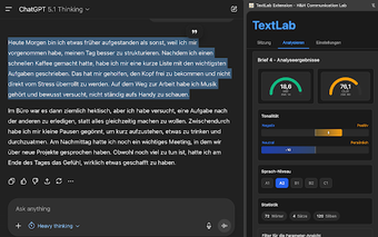 Användarvänligheten hos TextLab Extension är en av dess starka sidor. Användare kan enkelt markera text på ChatGPT eller m365 Copilot-webbplatser och välja texttyp för analys. Resultaten presenteras i en elegant sidopanel med interaktiva mätare och diagram, vilket gör det enkelt att förstå analyserna. Dessutom prioriterar TextLab användarnas integritet genom att säkerställa att data förblir på den egna TextLab-servern, utan tredjeparts spårning eller datainsamling, och följer GDPR-föreskrifter.
